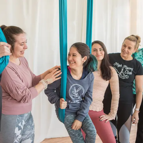 Want to book a group aerial yoga lesson for an upcoming birthday party, Girl Scouts troop outing, team building event or any other occasion? We’d love to host you! Head to our Private Parties page to review your options and book.