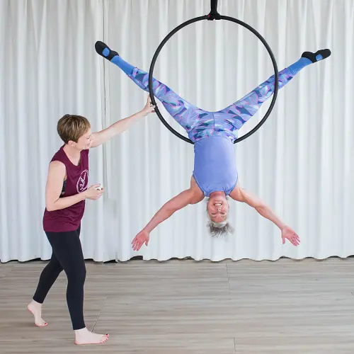 This intro session is perfect for a beginner brand new to aerial hoop. Trying aerial hoop for the first time in a group class can be intimidating, and some students may benefit from individual instruction. Private sessions are for those who would prefer to begin their practice in a one-on-one setting. Your instructor will guide you through the fundamental skills required to establish a safe and balanced aerial hoop practice at your own pace.